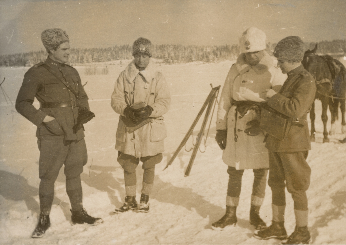 Vinterbild med fyra soldater från Södermanlands regemente I 10. Till vänster: löjtnant Gunnar Henricson och major Gustaf Frithz.