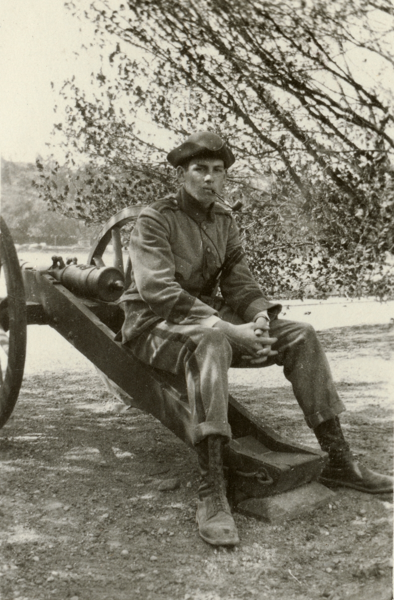 Titel: Elev från Krigsskolan Karlberg har rökpaus vid kanon.