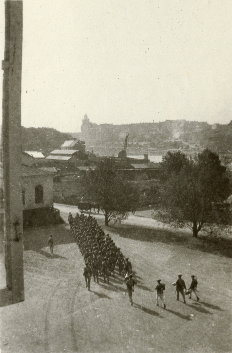 Elever på Krigsskolan Karlberg marscherar på gårdsplanen utanför Karlbergs slott, Stockholm.