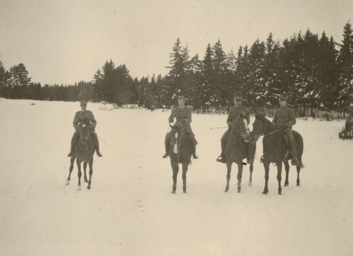 Titel: Vinterbild med soldater från Södermanlands regemente I 10 till häst.