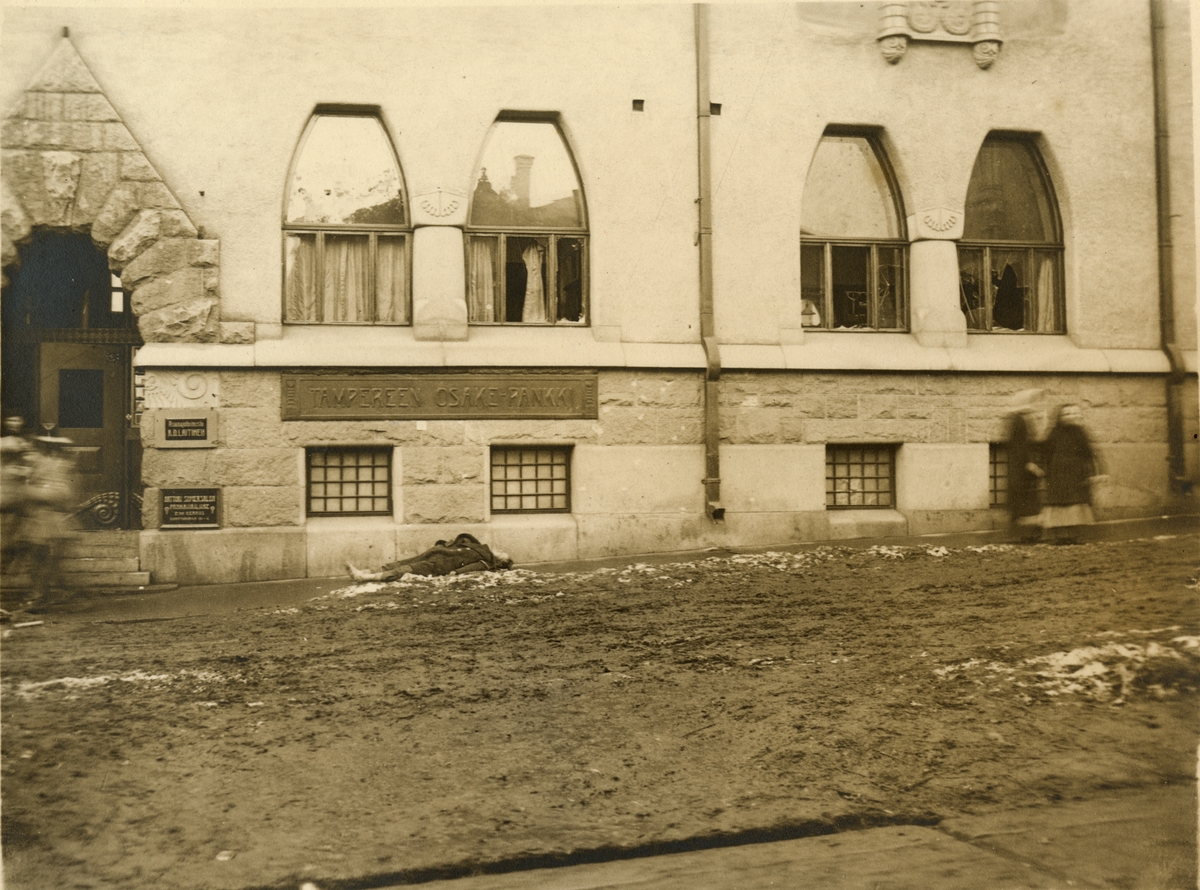 Titel: Text i fotoalbum: "Tampereen Osakepankki plundrad".