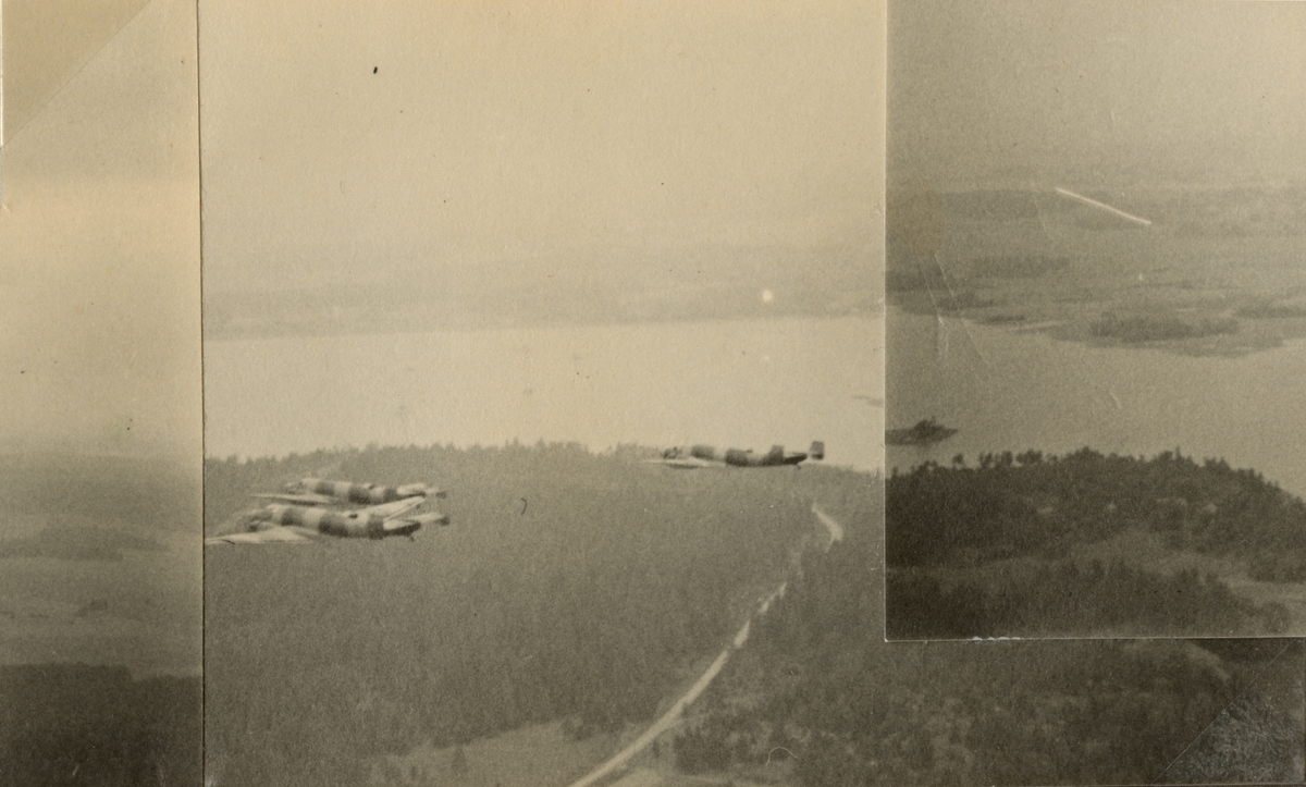 Text i fotoalbum: "Besök vid Västmanlands flygflottilj. Första tunga bombflottiljen är ute på rekogniseringstur."