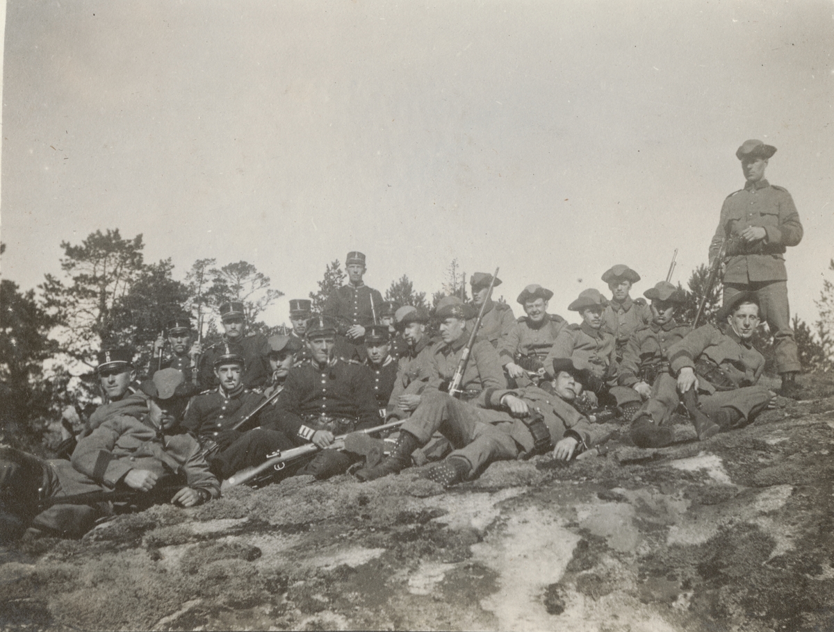 Titel: Gruppfoto av soldater från Göta livgarde I 2 på ett berg.