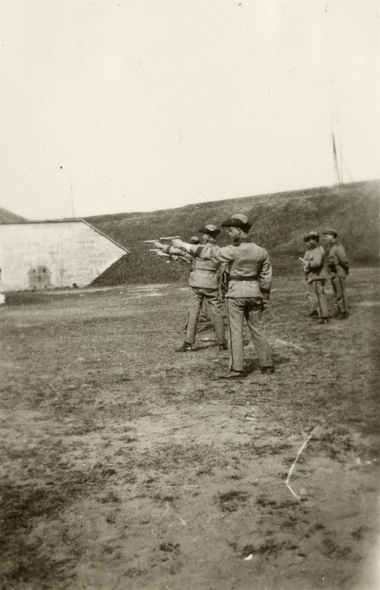 Titel: Text i fotoalbum: "Officersaspirantskolan 1925-1926. Pistolskjutning".