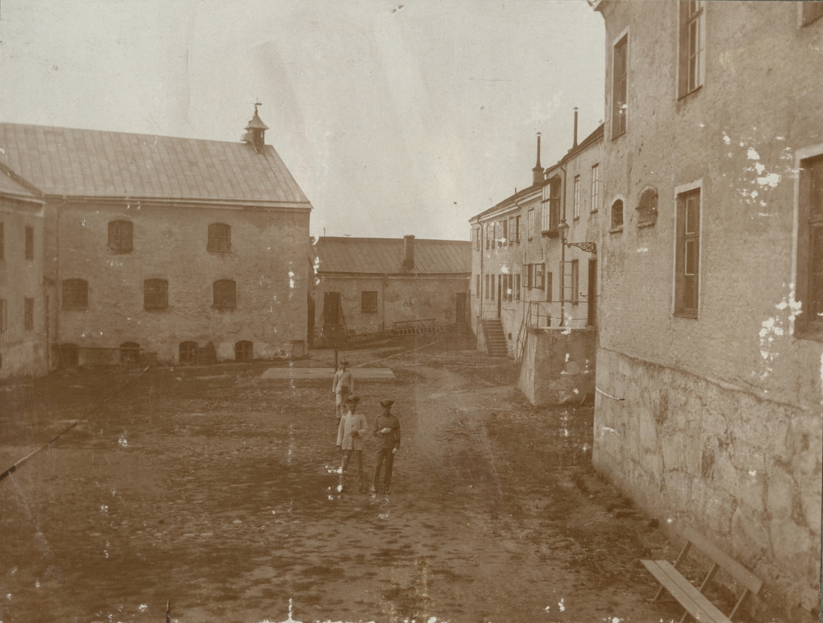 Titel: Tre soldater inne i Varbergs fästning uppställda för fotografering.