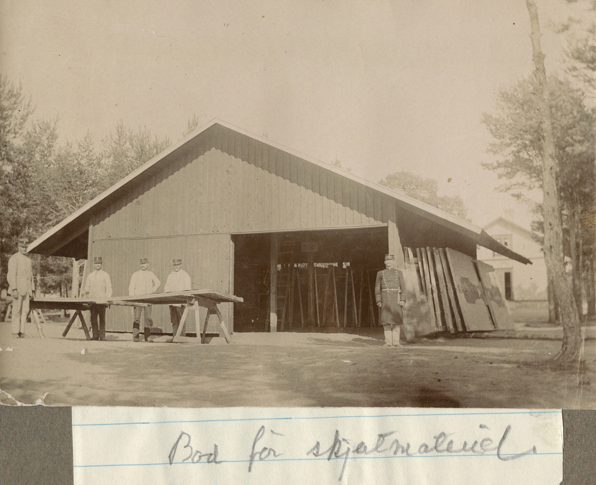 Titel: Soldater gör iordning måltavlor framför förrådsboden.