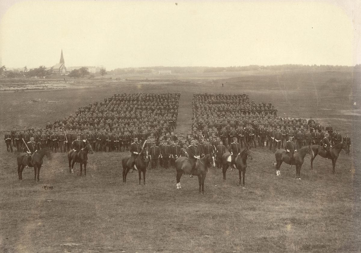Grupporträtt av Svea livgarde I 1 på Ladugårdsgärde år 1896, i bakgrunden Gustav Adolfskyrkan.