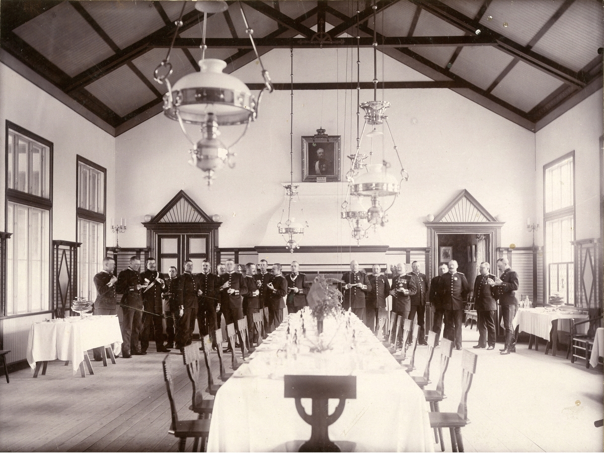 Titel: Grupporträtt av officerare vid Hälsinge regemente I 14 på officersmässen i Mohed 1899.