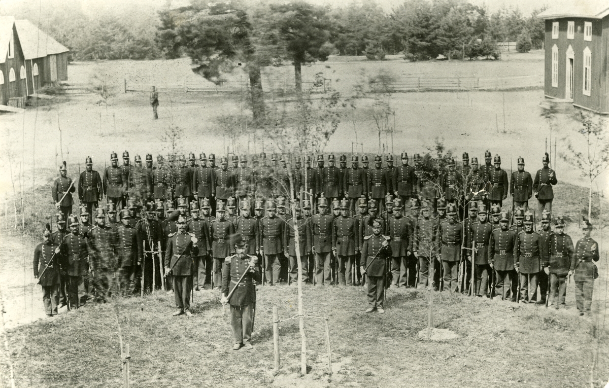 Titel: 14 trupp vid Hälsinge regemente I 14 stående på gårdsplan med nyplanterade Björkar.