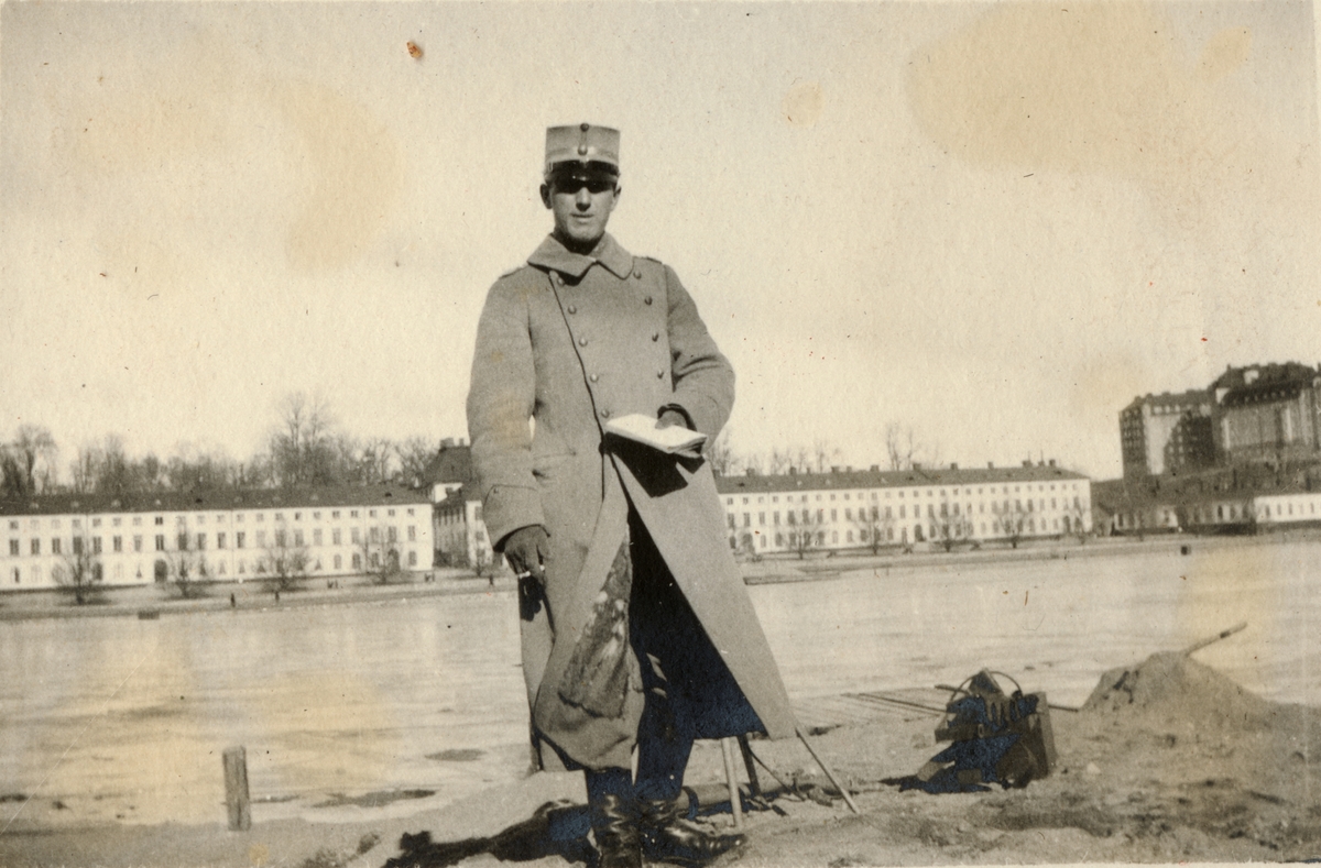 Titel: Text i fotoalbum: "Förbindelsekursen 1920". Soldat med signalutrustning vid vattendrag.