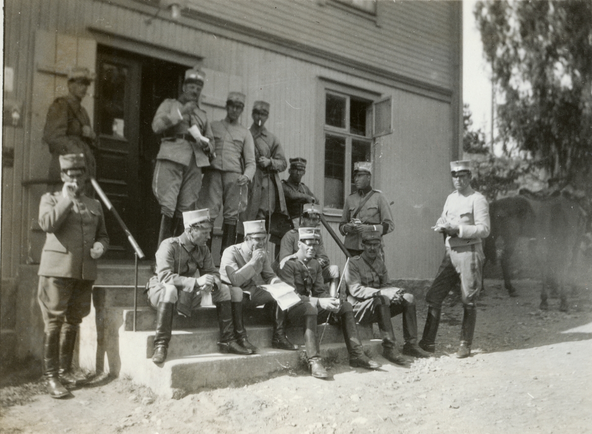 Titel: Text i fotoalbum: "Förbindelsekursen 1920". Gruppbild med soldater på trappan.