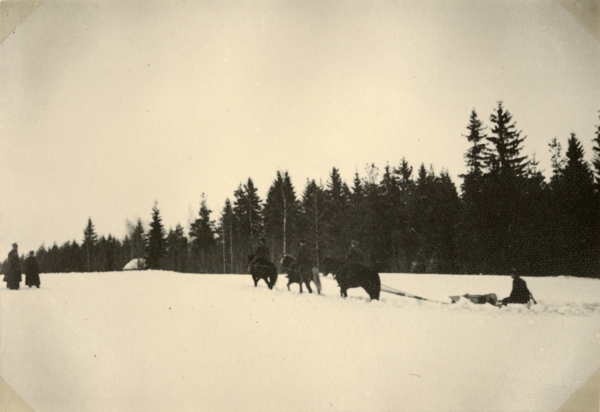 Titel: Text i fotoalbum: "Studieresa med general Alm till Finland 1.-12. mars 1939. Hästplogning."