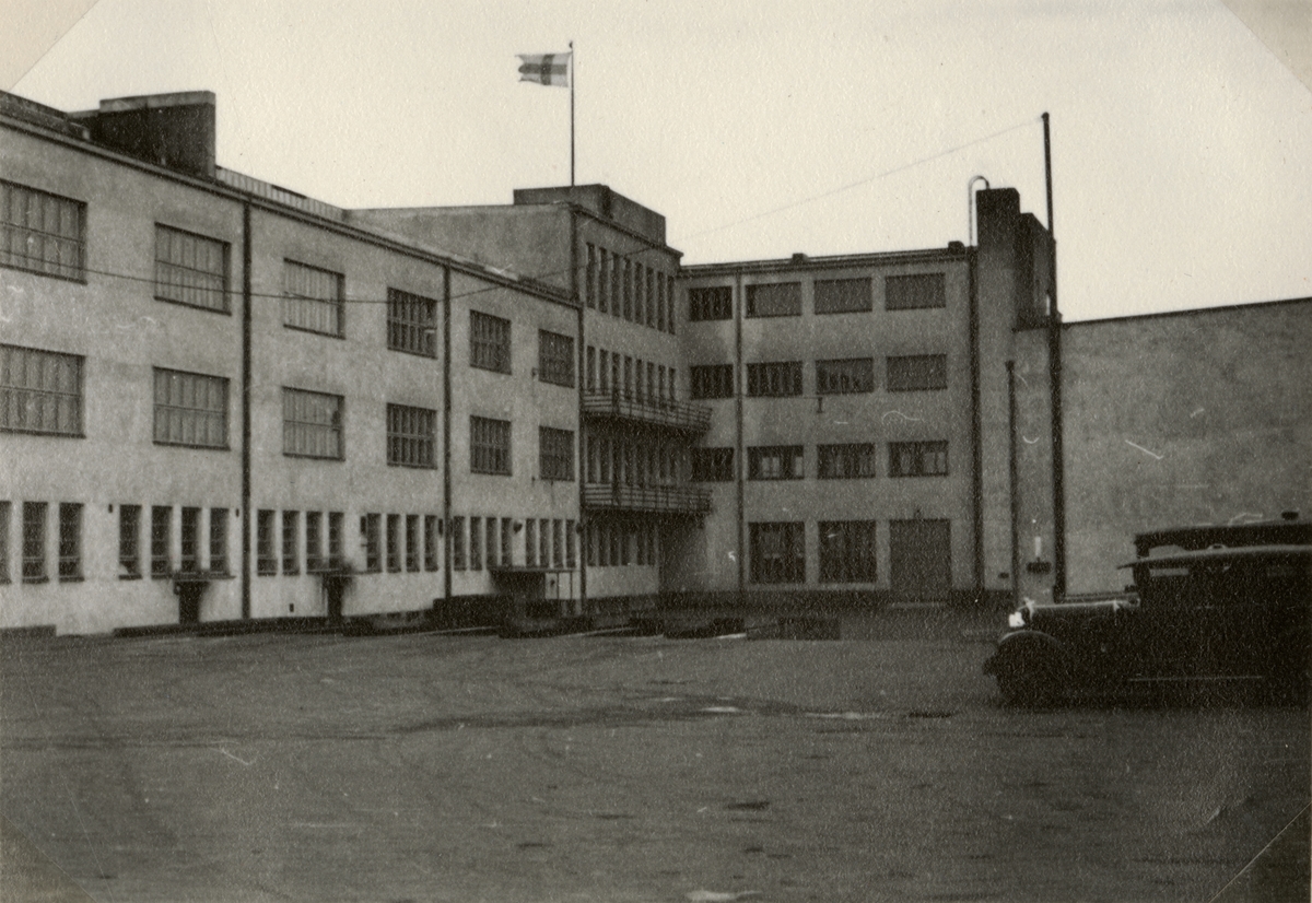 Text i fotoalbum: "Studieresa med general Alm till Finland 1.-12. mars 1939. Ny kasern i Helsingfors, automobilkompaniet."