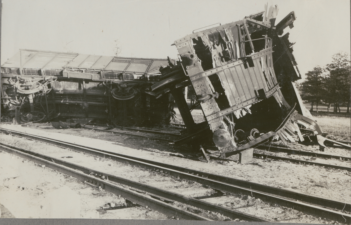 Titel: Text i fotoalbum: "Järnvägsolycka genom flygarebomb".