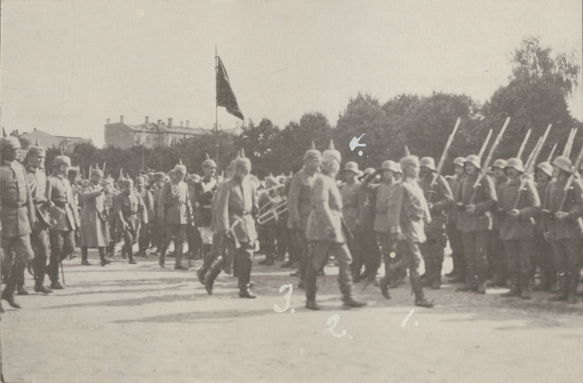 Text i fotoalbum: "Landwehr Inf. Rgt. 34 (mitt regemente) paraderar för Kajsaren. 5 september 1917. Kajsarens besök af trupperna i Riga. Afordning af mitt regemente vid den stora paraden."