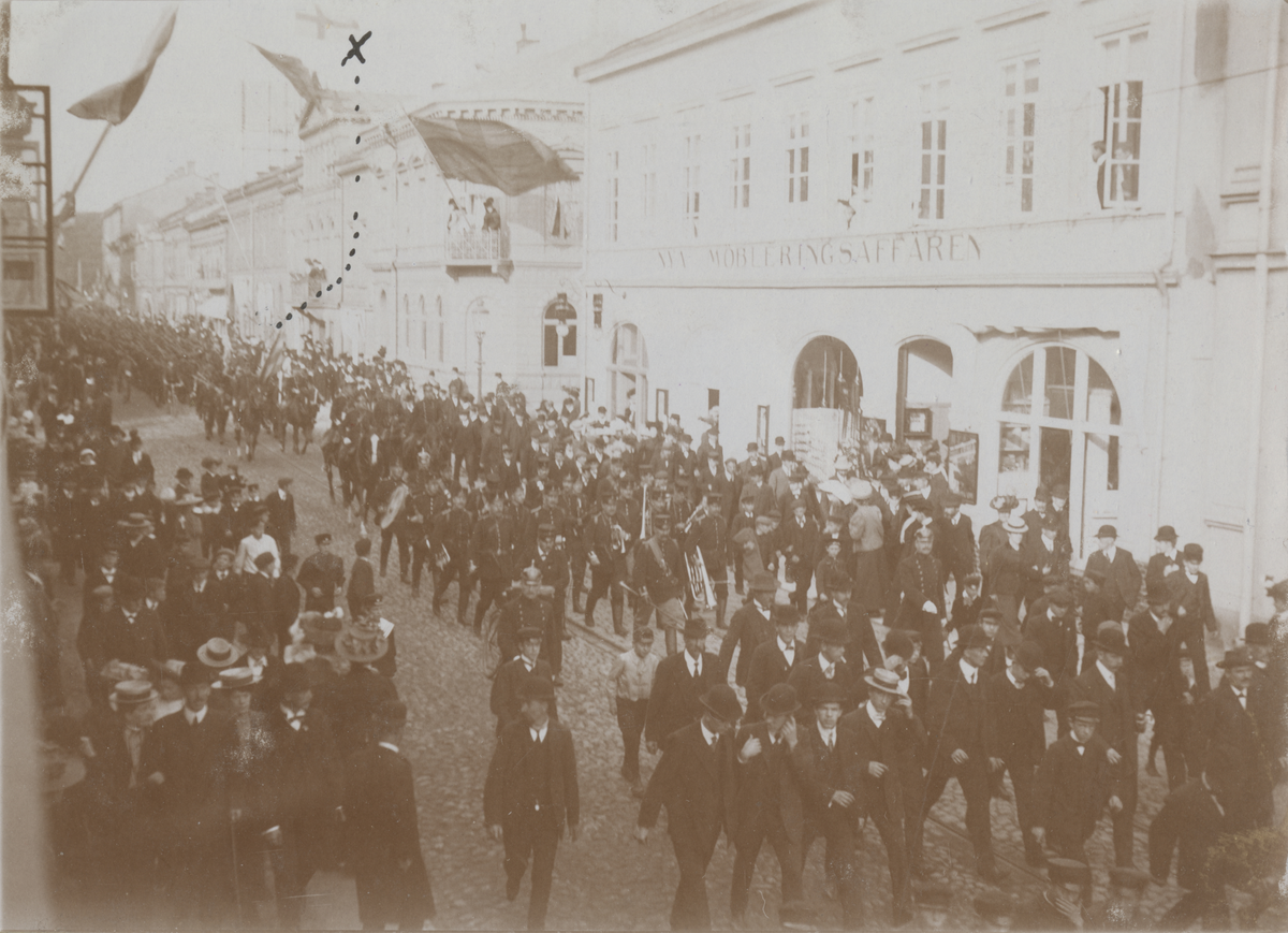 Titel: Text i fotoalbum: "Intåget" i Jönköping 1908 (på marsch till Grenna-manövern)."