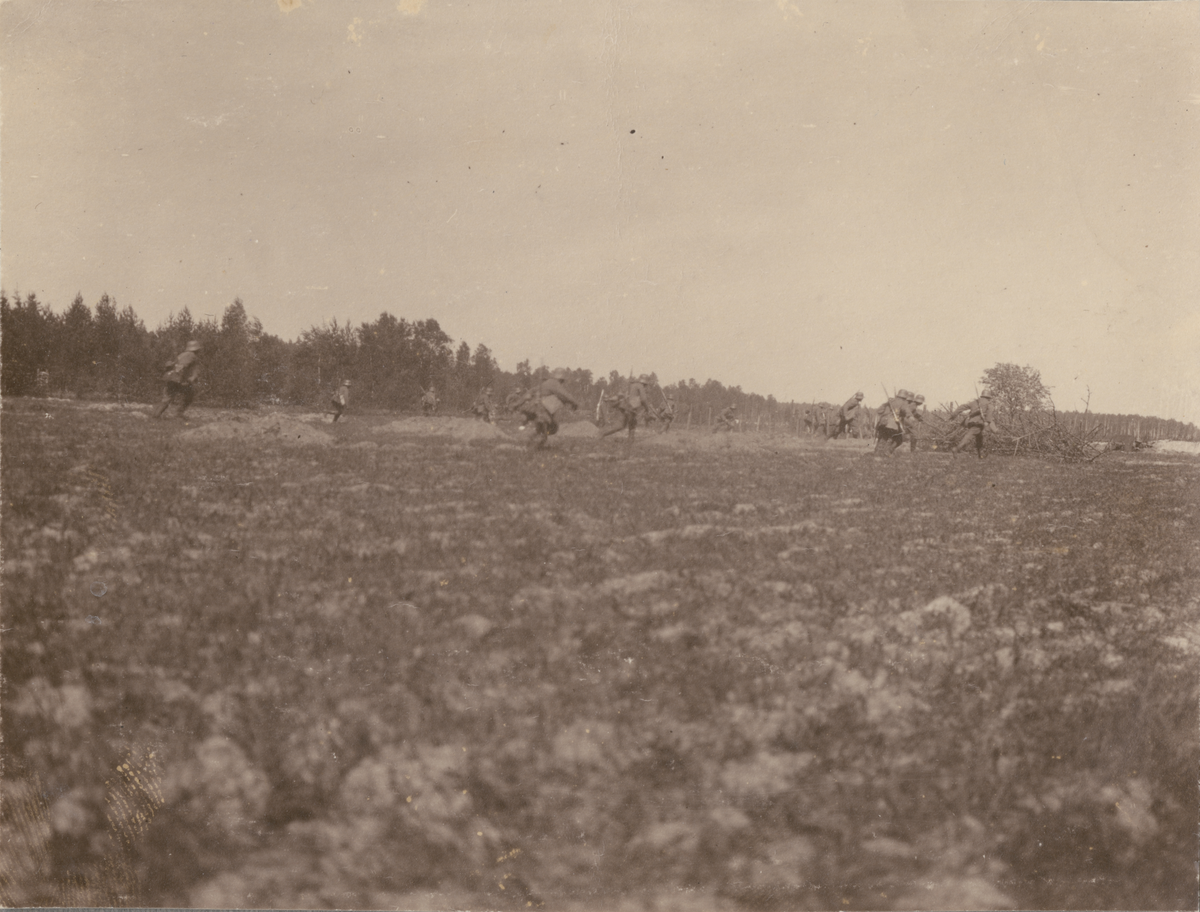 Text i fotoalbum: "Maj 1917. Besiktning af min stormgrupp vid Jaunsem-Zorndorf den 14 juni 1917. En af de många föröfningar för offensiven mot Riga i början på september 1917.