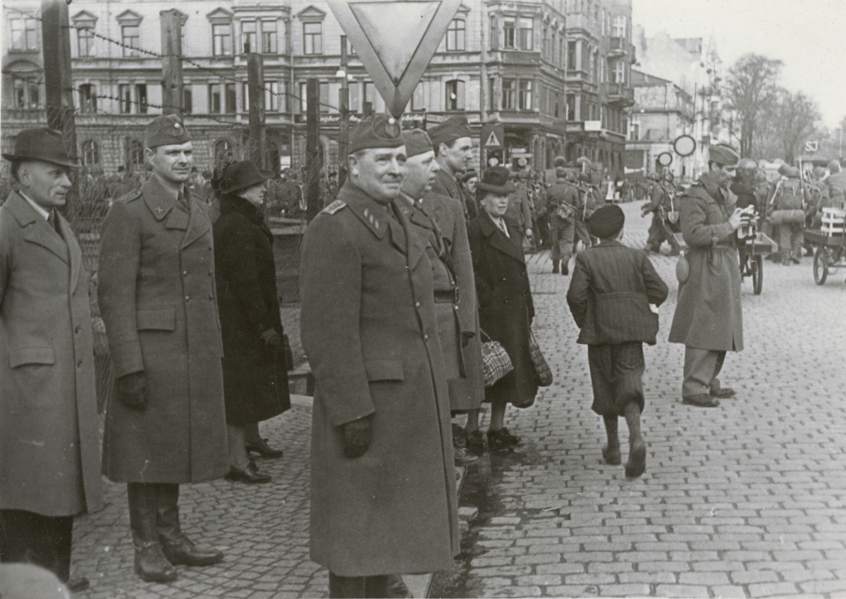 Titel: Soldater och civila samlade vid vägkanten i Helsingborg.