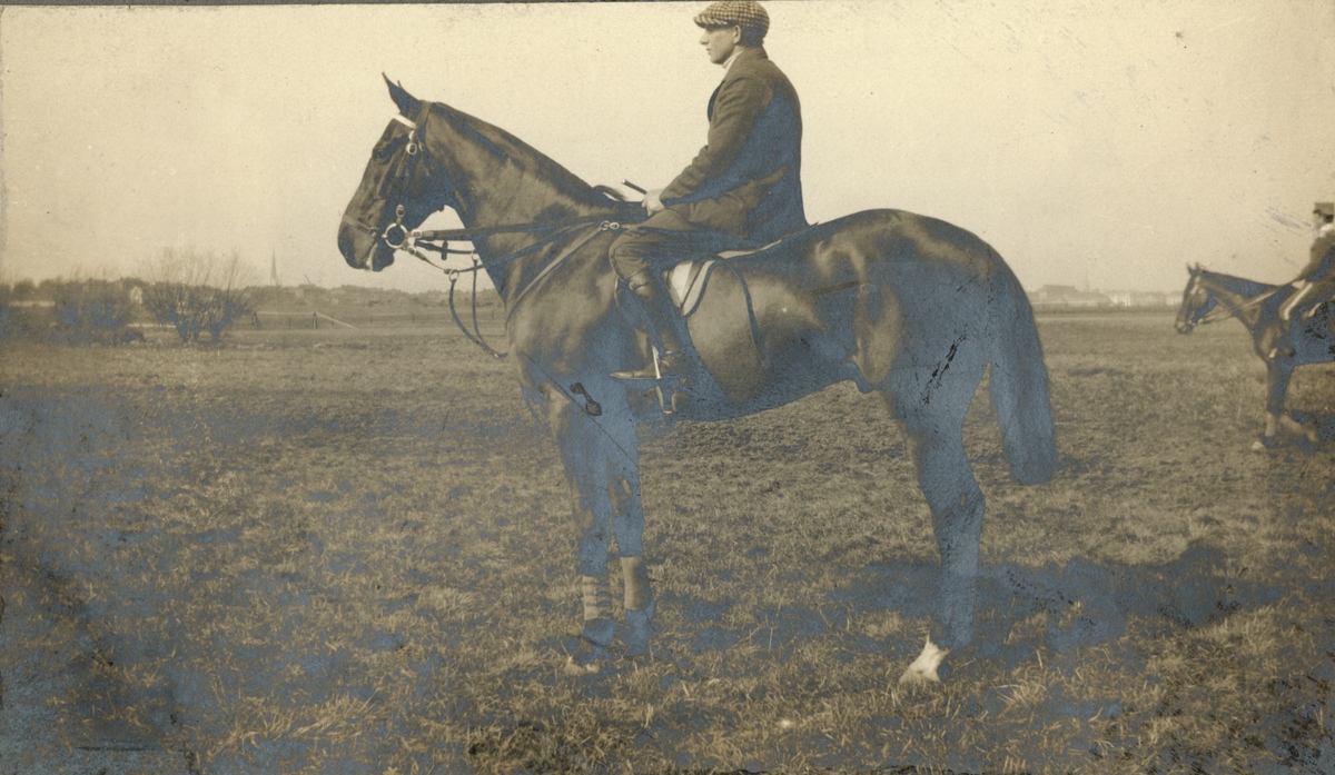Titel: Text i fotoalbum: "Ränneslätt K 4 Kav. aspirantskola 1900". Man till häst.