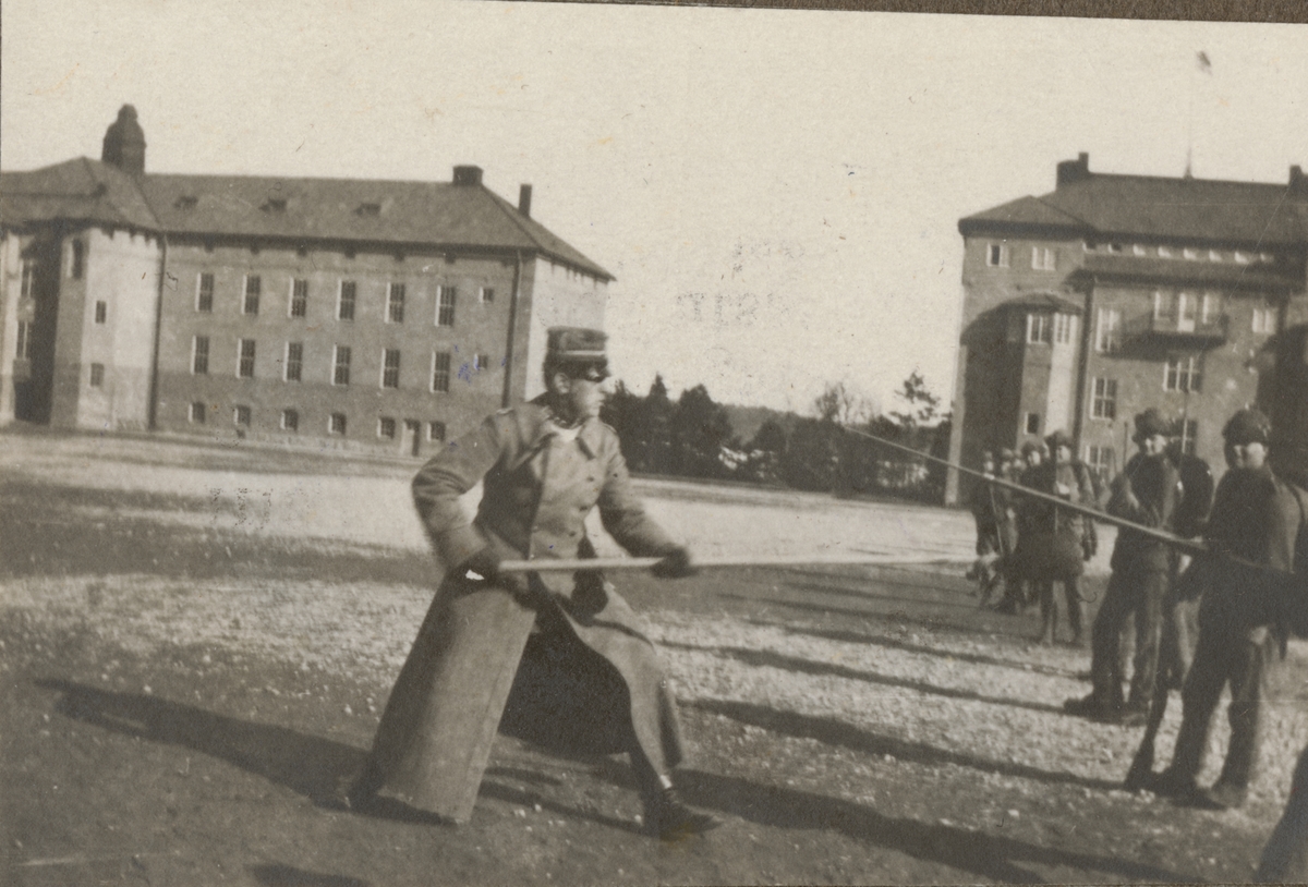 Titel: En soldat fäktar med spade. Soldater i rad står och iakttar händelsen.