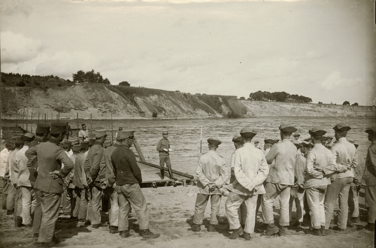 Titel: Elever från Krigsskolan Karlberg bygger pontonbro över vattendrag.