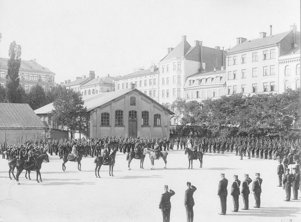 Positionsartilleret A 9 på kaserngården vid Storgatan 1903, soldaterna iförda uniform m/1886. Till vänster spelar musikkåren, i mitten ett flertal officerare till häst.