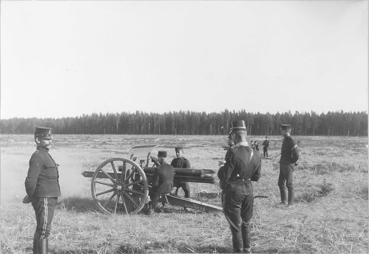 Svea artilleriregemente A 1 under skjutövning med tysk kruppkanon 7,5 cm kanon m/1902 på Marma skjutfält. Fotot har fångat den närmaste kanonens rekyl.
