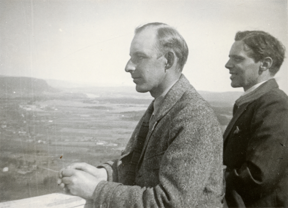 Text i fotoalbum: "Int.asp.tjänstgöring i Sollefteå sommaren 1933. På Hallstabackens torn med Gunnar Bergman".