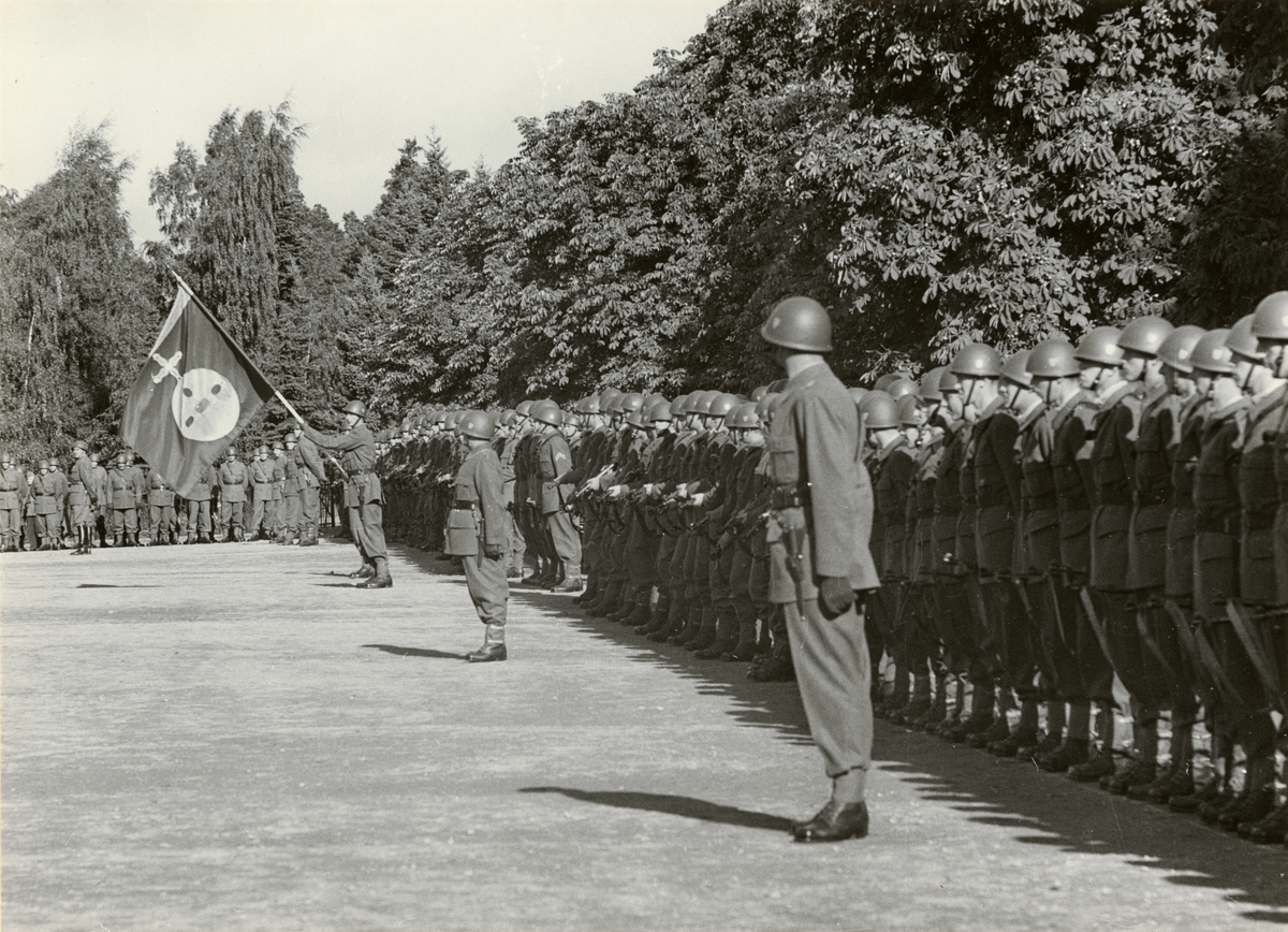 Text i fotoalbum: "Fanöverlämning 27 september 1955. Fanmarsch. Fr v: major H. Holmberg, kapten H. Norgren (fanförare), kapten I. Söderblom, kapten C. Ahlin".