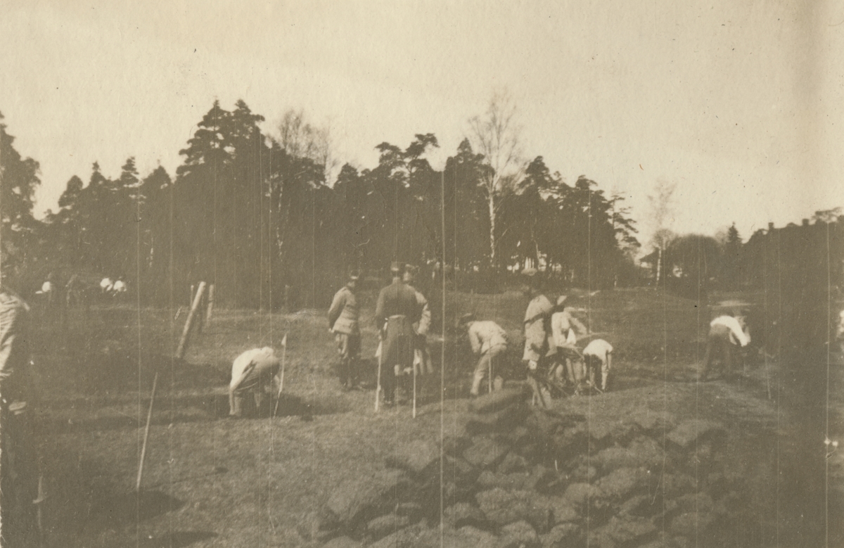 Titel: En grupp soldater i arbete med en försvarsanläggning.
