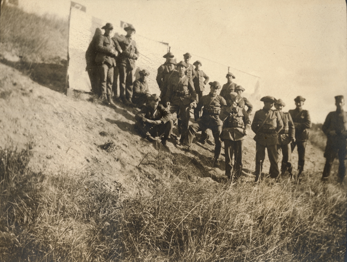Titel: Text i fotoalbum: "Skjutbanan vid Mytinge. Tropp ur 9. komp markörer vid terränglinjeskjutning."