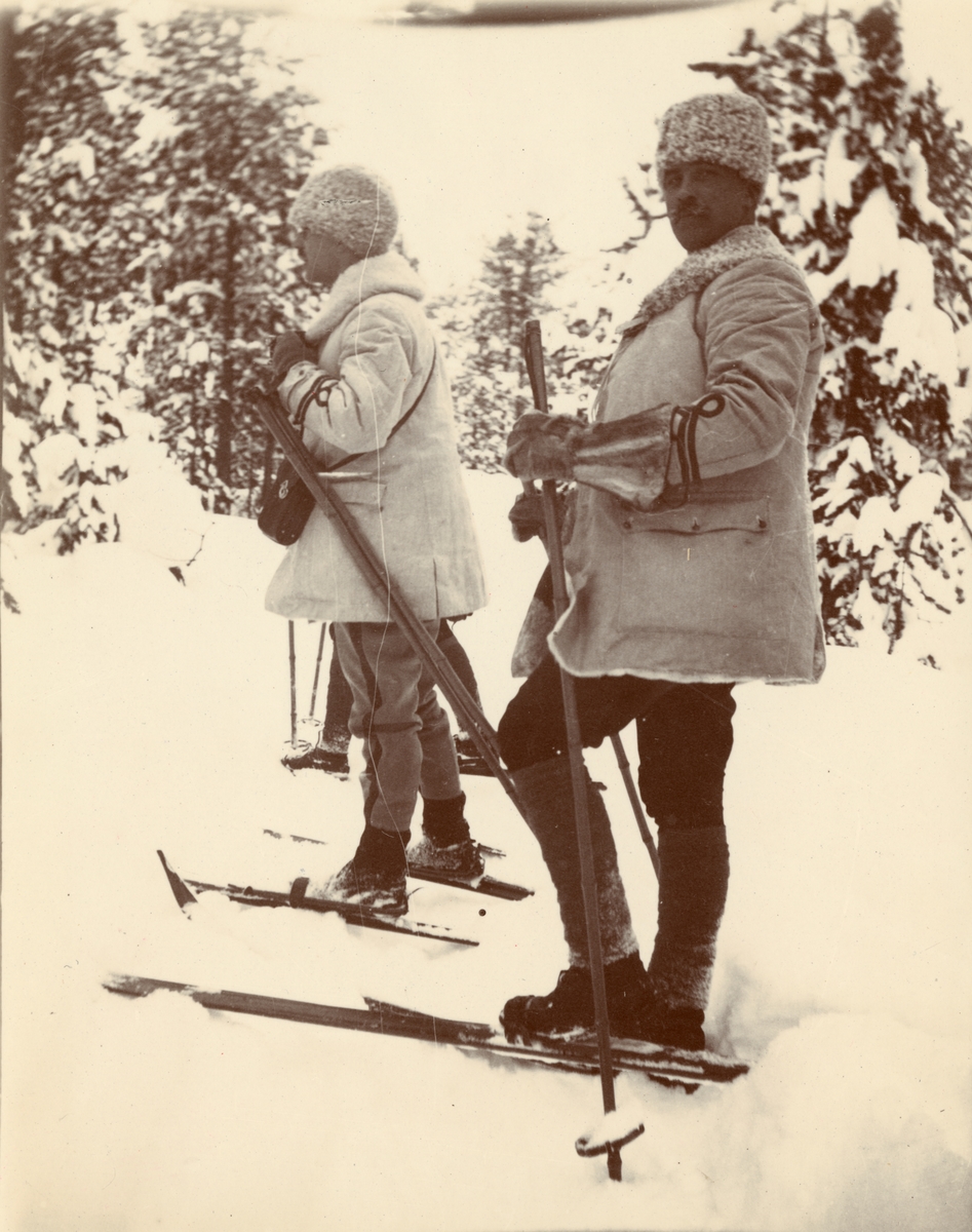 Titel: Officerare från Smålands husarregemente K 4 på skidor, vinterövning i Norrbotten omkring 1910.