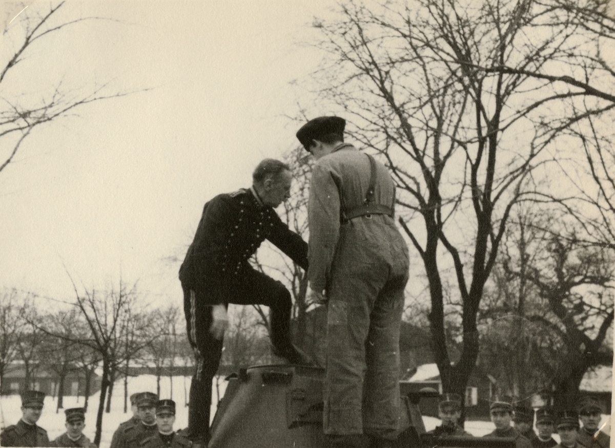 Text i fotoalbum: "AIHS studiebesök vid I 2 strdvbat (Göta livgardes stridvagnsbataljon) 19.1.1938. Överste Sjöberg är intresserad."