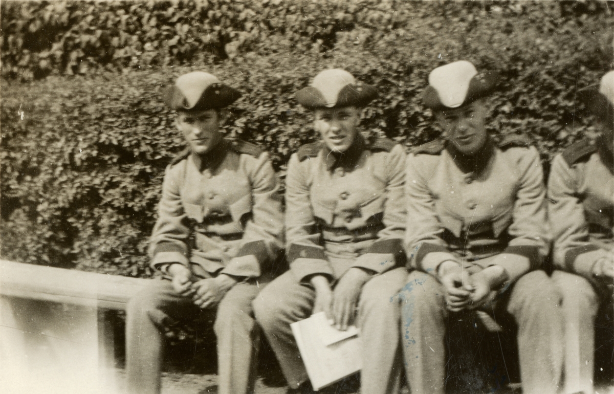 Text i fotoalbum: "Och så blev man skrudad i kronans "granna" uniform samt hyrde sig ett rum för "studier. Norlin, Alm, Nilsson".