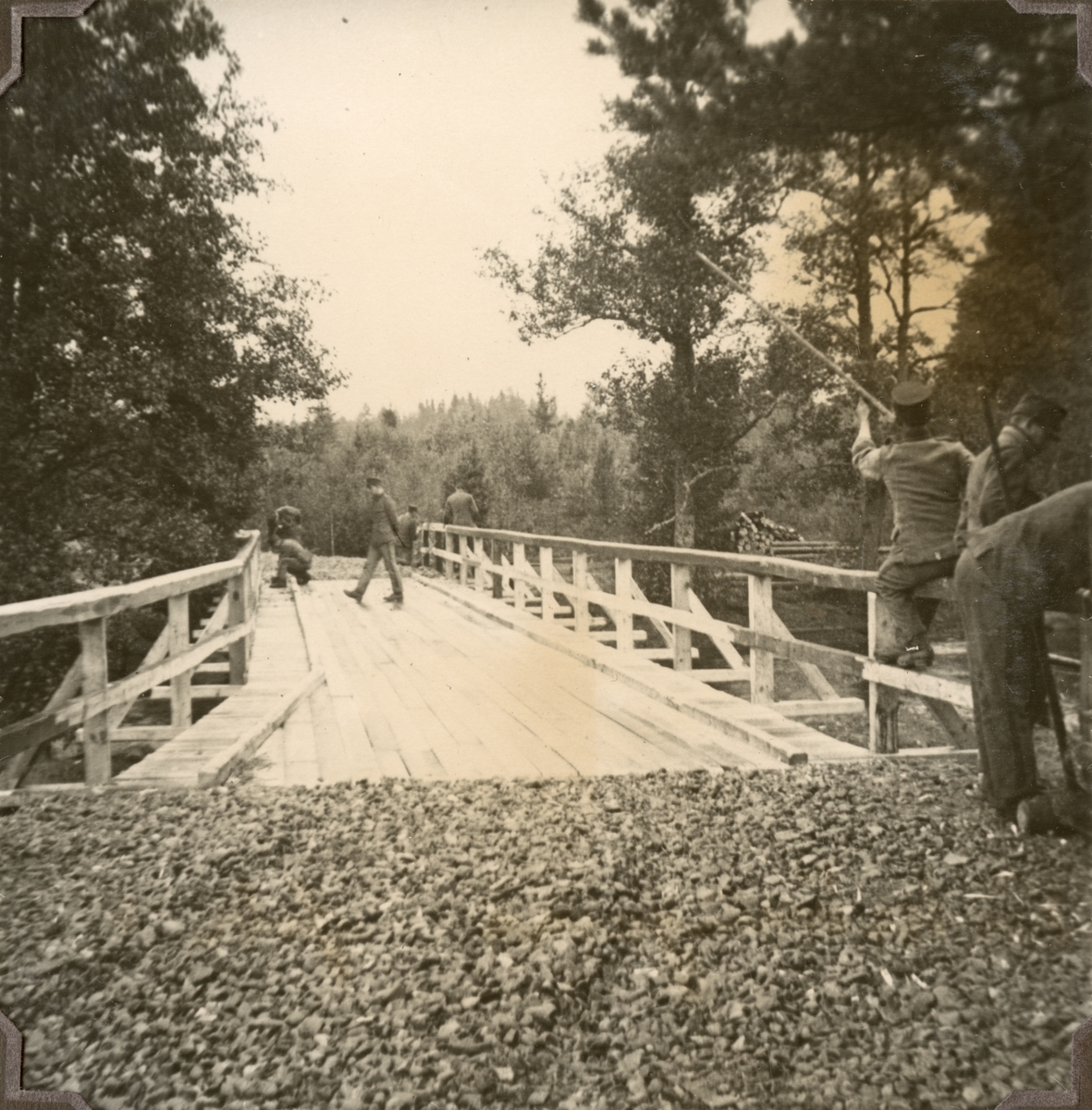 Text i fotoalbum: "Som avslutning på repetitionsövningarna 1935 fick jag med ett kompani bygga en liten landsvägsbro söder om Eksjö vid Qvarnkullen. Brobygget vid Qvarnkullen nalkas sin fullbordan. Brobyggaren själv".