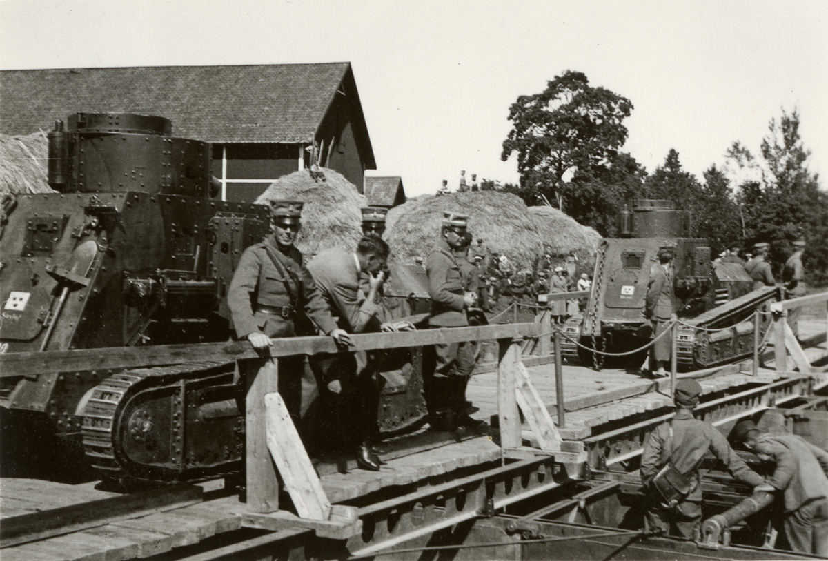 Text i fotoalbum: "Under brobygget vid Westanå hade vi besök av stridsvagnar, som provbelastade de olika brotyperna. Inspektionsherrar".