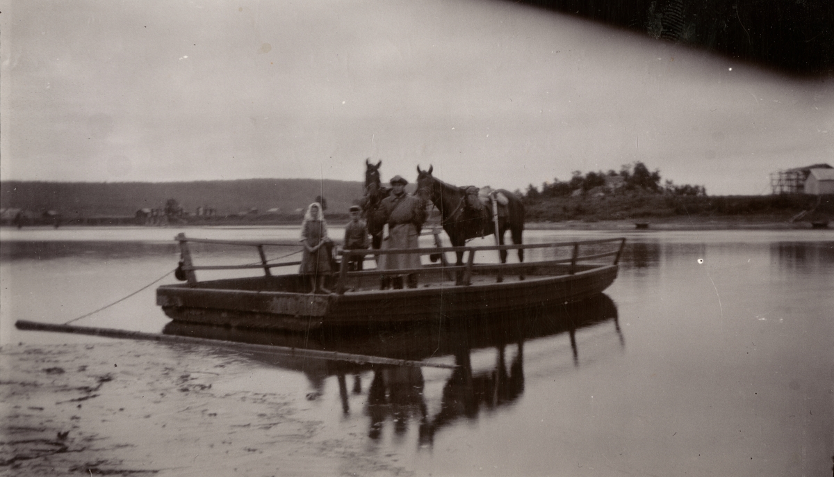 Titel: Carl Bernadotte af Wisbog och Sandström på väg över Spölands färja.