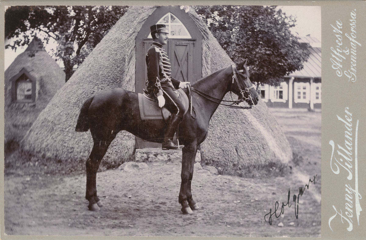 Porträtt av Holger Rosencrantz till häst, underlöjtnant vid Skånska husarregementet.