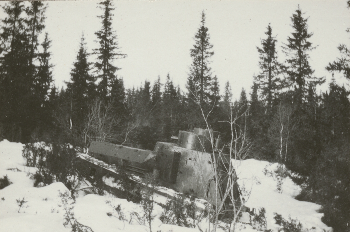 Stridsvagn m/1921 (eller m/1921-1929) körs upp till fjäll. Stridsvagnskursen vid Göta livgardes stridsvagnsbataljon övar i djupsnö vid Abisko.