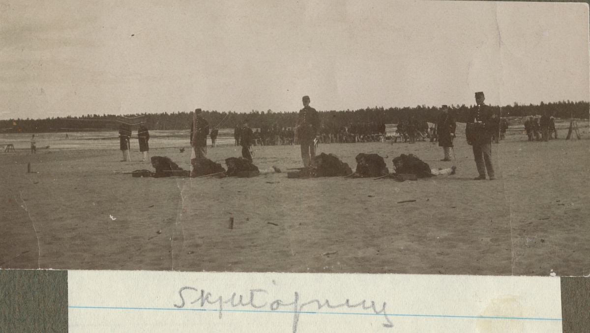 Titel: En grupp soldater över skytte i liggande skjutställning. Bakom skjutgruppen står instruktörerna.