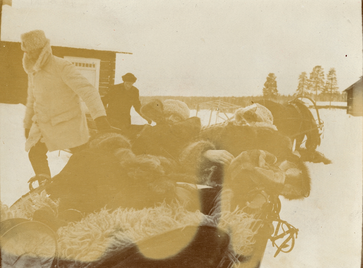 Officerare från Smålands husarregemente K 4 åker släde, vinterövning i Norrbotten omkring 1910.