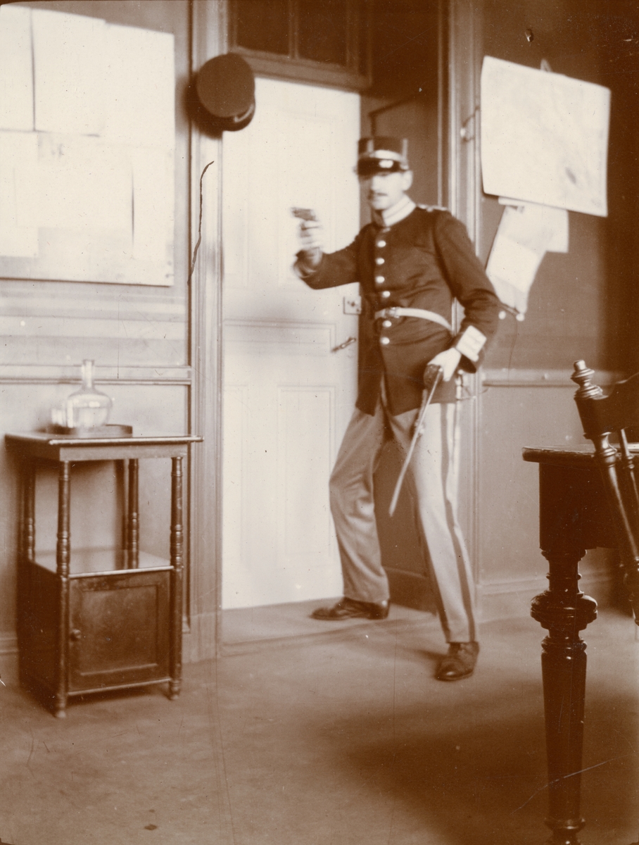 Titel: Soldat vid Göta livgarde I 2 poserar med pistol.