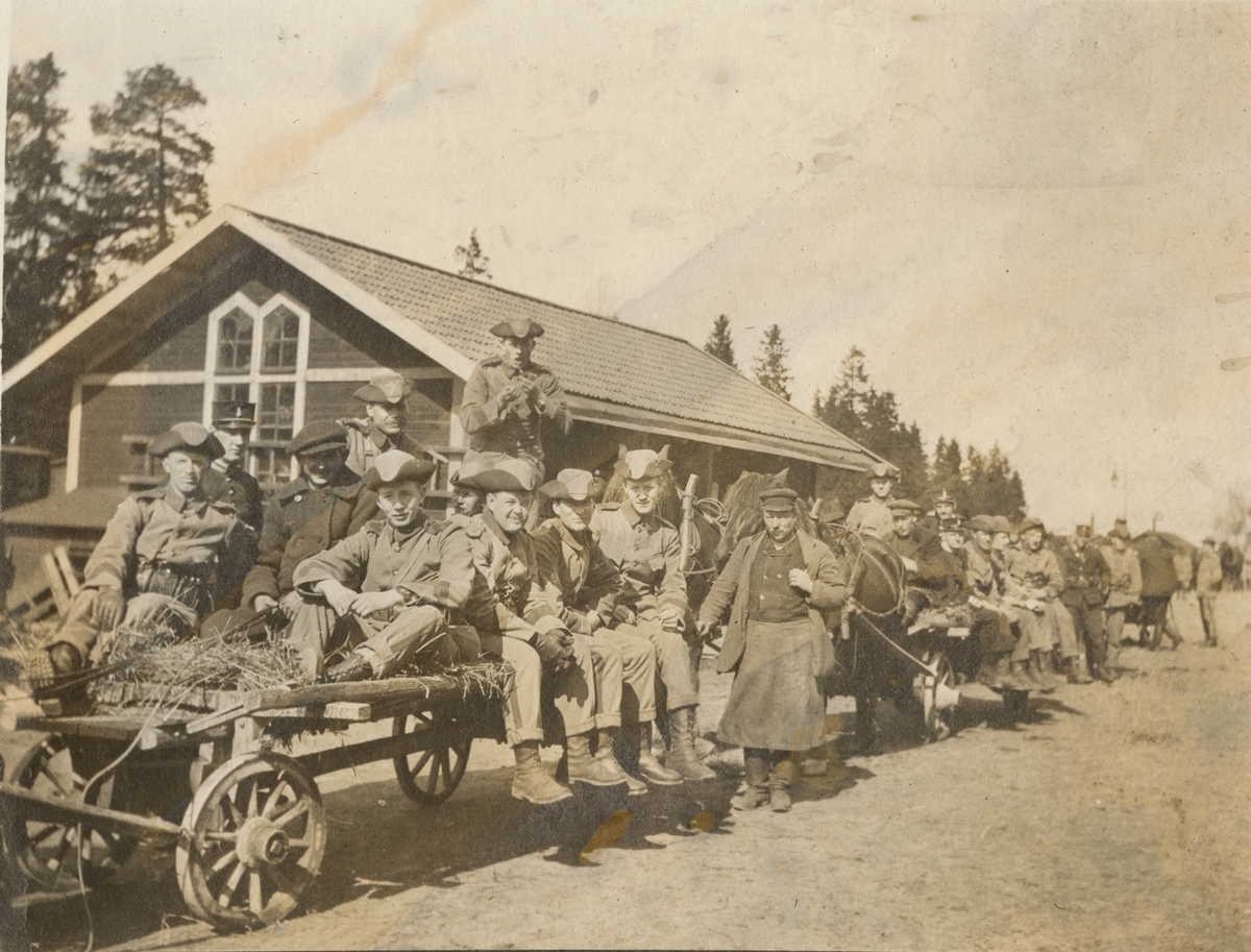 Titel: Gruppbild inför truppförflyttning. En hästdragen vagnkolonn med civillklädd kusk och soldater.