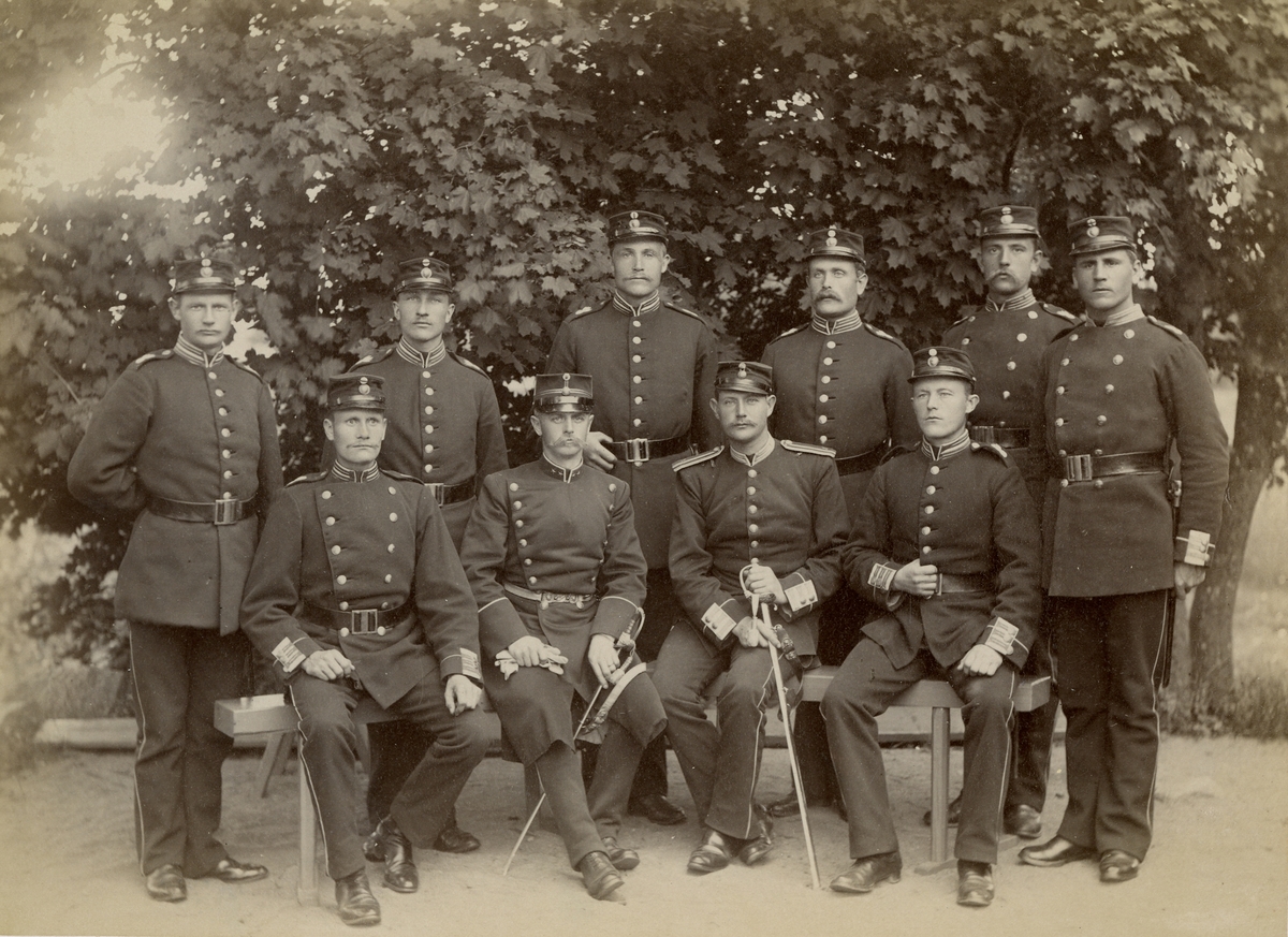 Titel: Grupporträtt av soldater vid Livregementets grenadjärer I 3 på Sannahed.