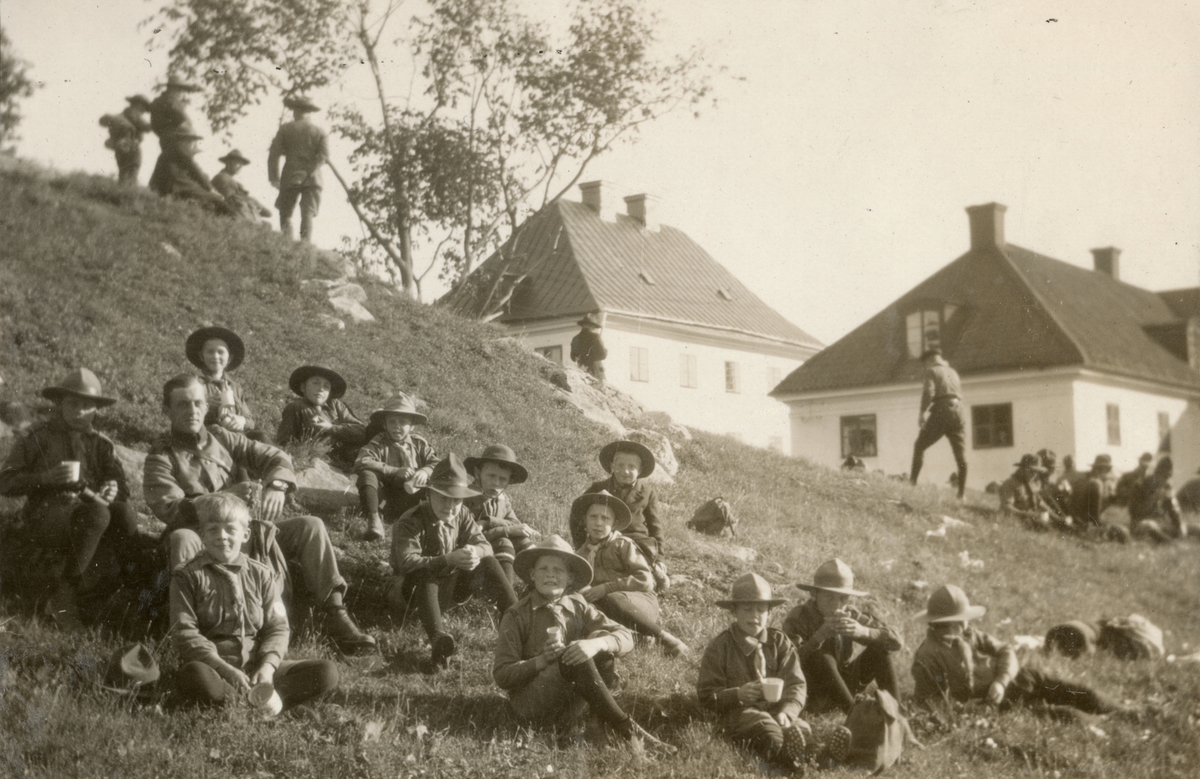 Titel: Bildtext: "Kåren deltog i Stockholms Scoutkårs manöver till Drottningholm 1919."