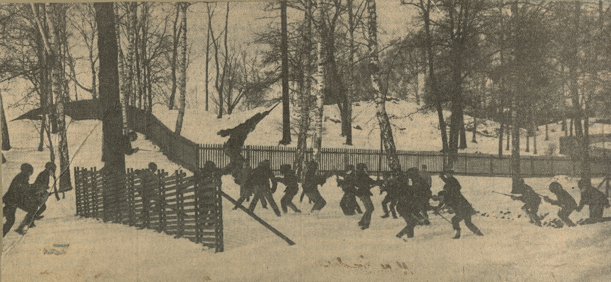 Titel: Text i fotoalbum: "Karlbergskadetter i fredlig batalj i snön".