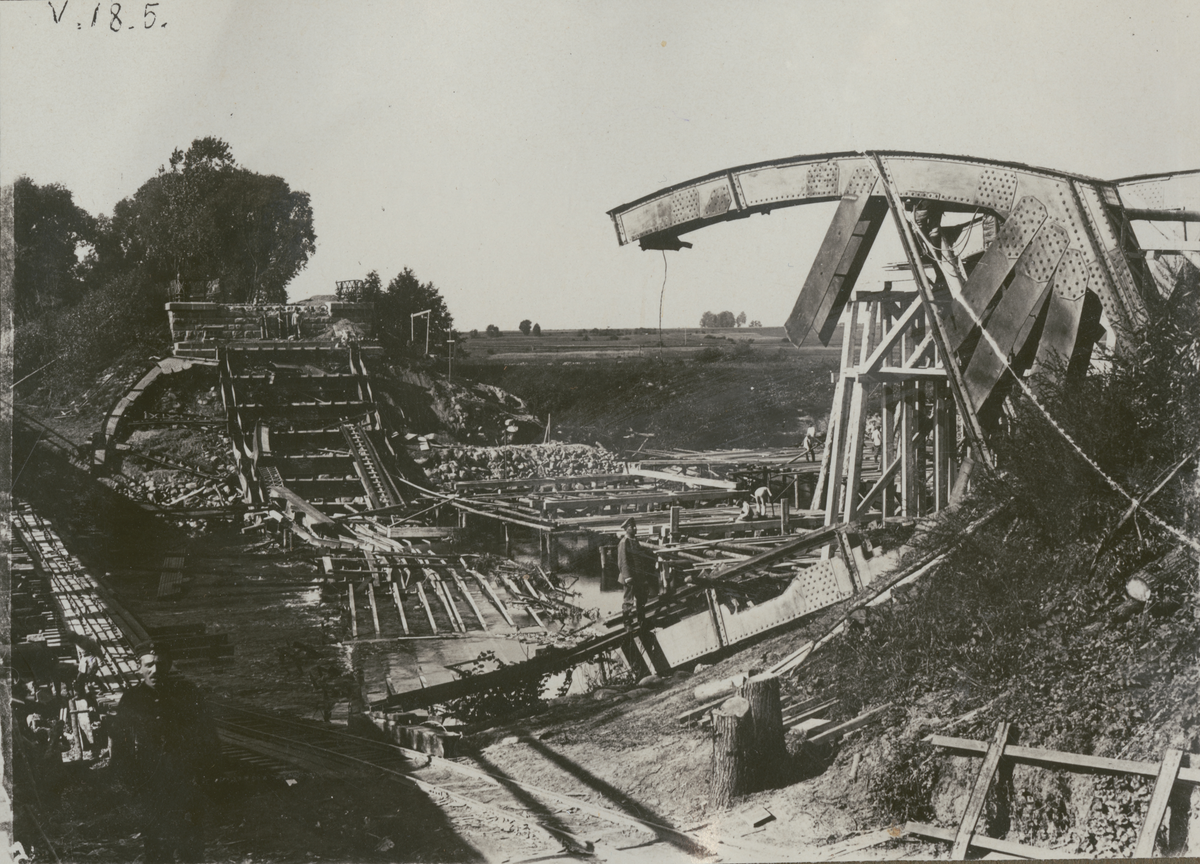 Titel: Text i fotoalbum: "Sprängd järnvägsbro".