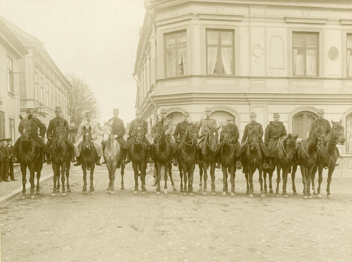 Officerare till häst på distansritt. Stora torget i Trosa, maj 1907.