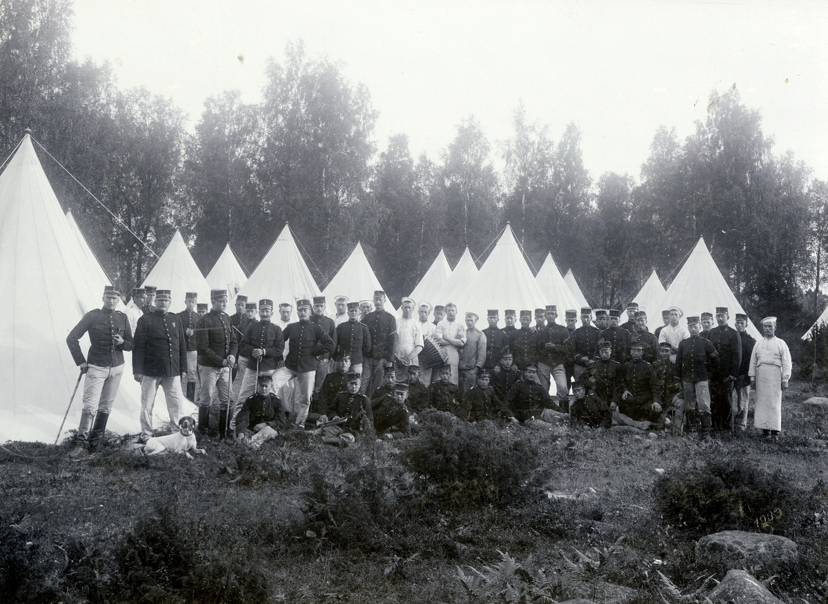 Titel: Grupporträtt av soldater framför tältläger, Karlsborg 1903.