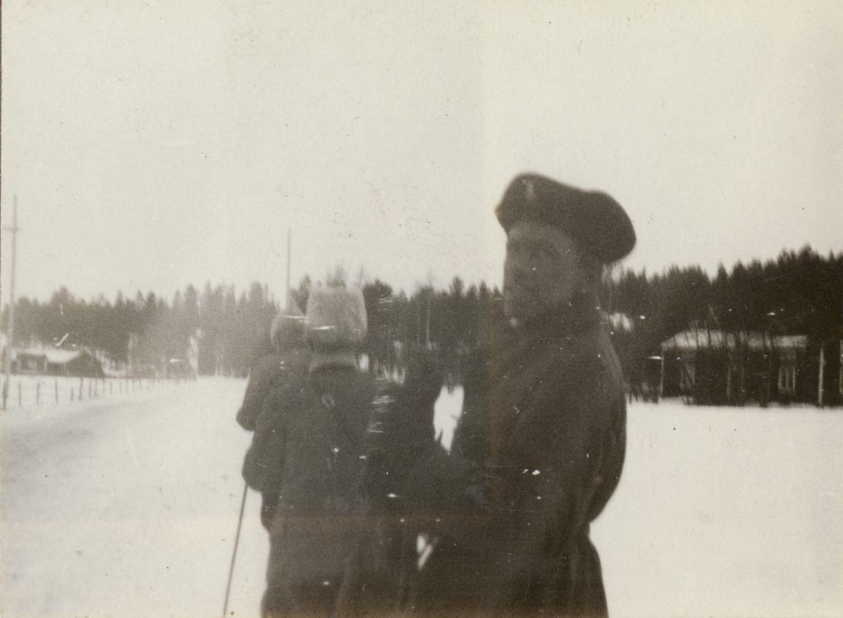 En trupp män i vinterövning vid Göta livgardes stridsvagnsbataljon år 1929. Mannen som vänder sig mot fotografen är enligt bildtexten Göran Schultz Göta livgarde I 2.